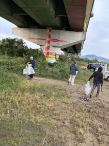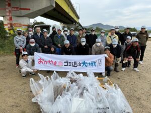 当日は、岡山地区の社員有志が高梁川河川敷、東ウイングバレイ構内の二手に分かれて清掃作業とごみの回収を行いました。